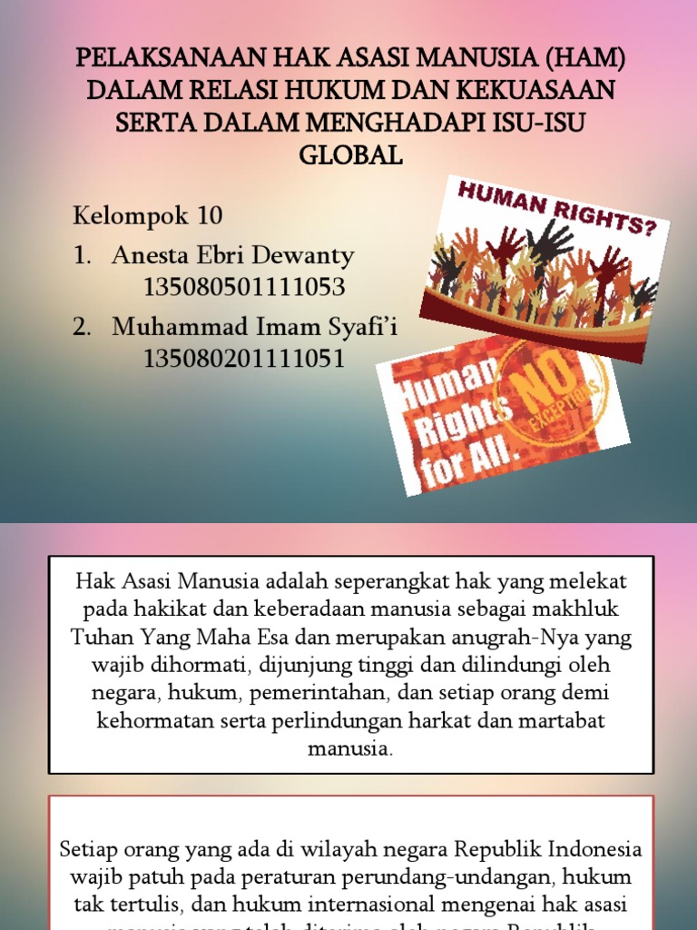 Segala puji dan syukur penulis sampaikan kehadirat allah swt, shalawat dan salam juga disampaikan kepada junjungan nabi besar muhammad saw. Hak bebas dari serangan terhadap kehadap kehormatan dan nama baik 11. Kandungan, hak tersebut adalah hak asasi manusia atau yang biasa disebut ham. Hak asasi manusia adalah hak dasar atau hak pokok yang melekat pada diri manusia sejak manusia diciptakan sebagai anugrah tuhan yme. Hakiki, artinya hak asasi manusia adalah hak asasi semua umat manusia yang sudah ada sejak lahir. Droits de l'homme) adalah sebuah konsep hukum dan normatif yang menyatakan bahwa manusia memiliki hak yang melekat pada dirinya karena ia adalah seorang manusia. 4 pengertian ham hak asasi manusia (ham) merupakan hak pokok atau hak dasar yang melekat pada diri manusia sejak manusia diciptakan kejahatan terhadap kemanusiaan, adalah perbuatan yg dilakukan dengan serangan yang meluas atau sistematik yang diketahui bahwa serangan. Hak asasi tidak dapat dilepas dengan. Hak atas perlindungan hukum 12. Asasi manusia diupayakan memiliki pegangan berupa block book dan buku. Hak asasi manusia terdiri atas dua hak yang paling fundamental, yaitu hak persamaan dan hak kebebasan. Meskipun hak manusia ini dijamin oleh hukum, namun tak jarang orang lain melanggarnya. Hak asasi manusia (ham) bukanlah suatu istilah yang baru di dalam masyarakat kontemporer.