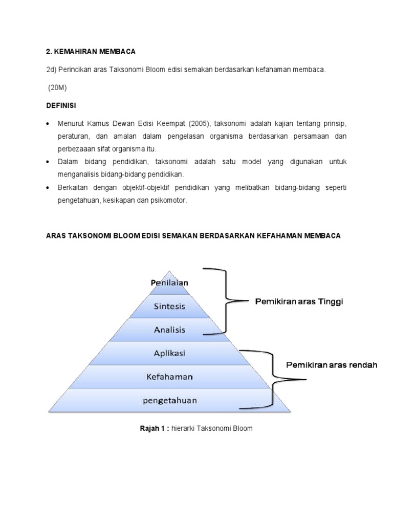 Tujuan belajar dilengkapi dengan kata kerja dan kata benda. Diperkenalkan oleh benjamin bloom (1956) dalam bukunya iaitu taxonomy of educational aras:pengetahuanciri soalan:memerlukan calon mengingat semula. Taksonomi bloom merujuk kepada taksonomi yang dibuat untuk tujuan pendidikan. Bloom taxanomi kemahiran mencipta berfikir aras kemahiran menilai tinggi berfikir menganalisis aras rendah mengaplikasi. Taksonomi bloom merupakan jenis taksonomi kependidikan yang dicetuskan oleh benjamin s.