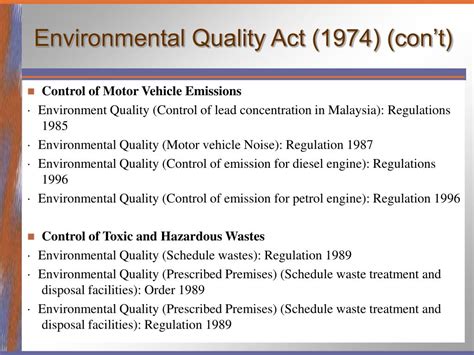This act makes provision for the prevention, abatement, control of pollution and enhancement of the environment. Powers and functions relevant to the protection of the environment are shared by the director general of environmental quality and the minister charged with the responsibility for. Date of royal assent : In malaysia, environmental acts and regulations were established in 1970's. Environmentalquality act 1974 amaranant thangaraju (1140) dzul nazrin abd rahman (1123) muisa syabani musyakir (1164) nurzawawi zul… 3.